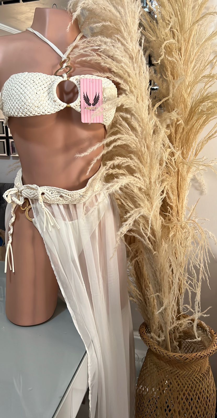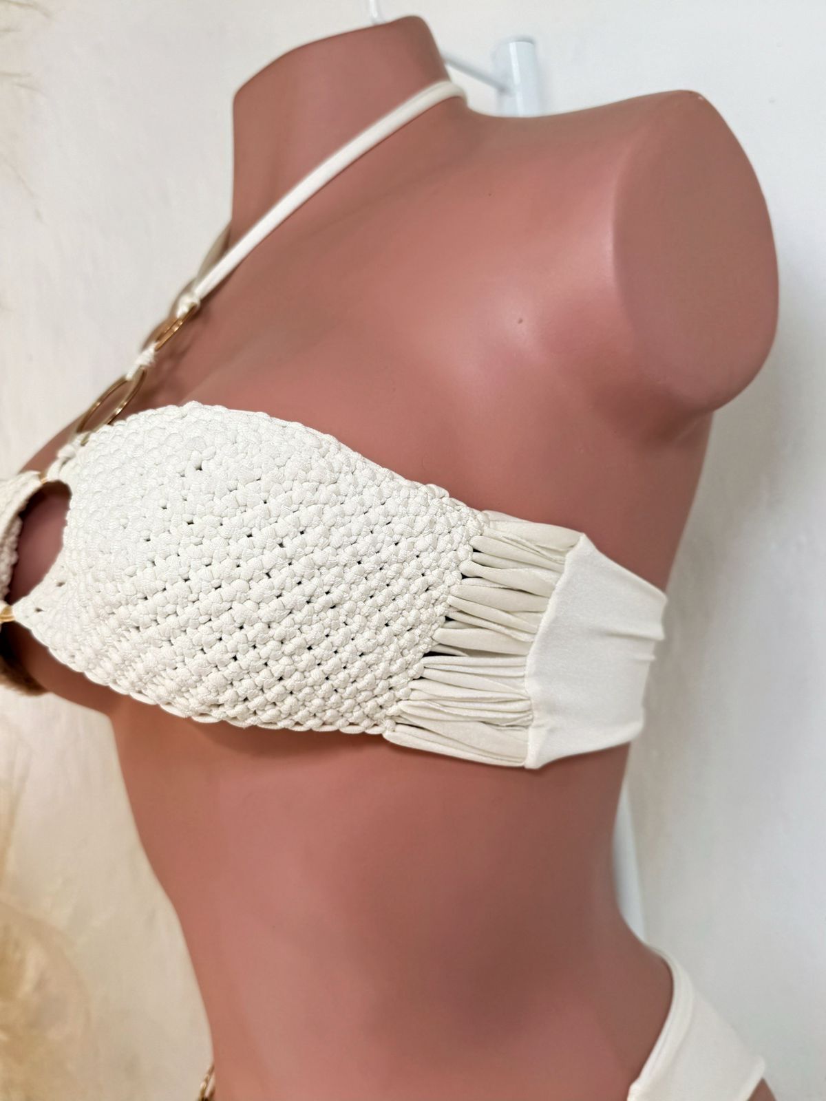 El bikini Bahamas combina un top tejido a mano en crochet con argolla central y cargadera al cuello, aportando ese aire bohemio que amamos. Su panty en licra color hueso con argolla lateral crea un equilibrio perfecto entre sofisticación y frescura.