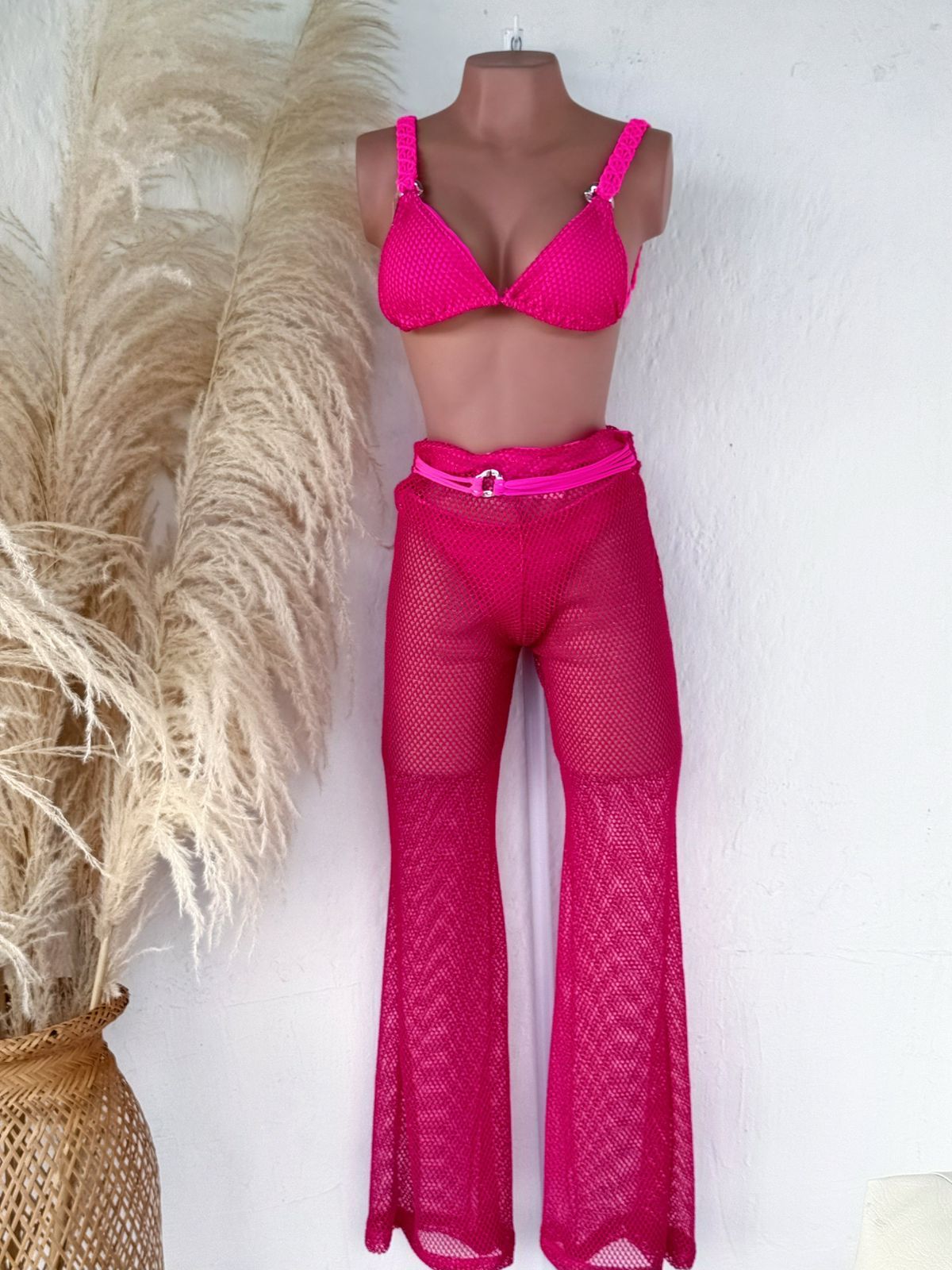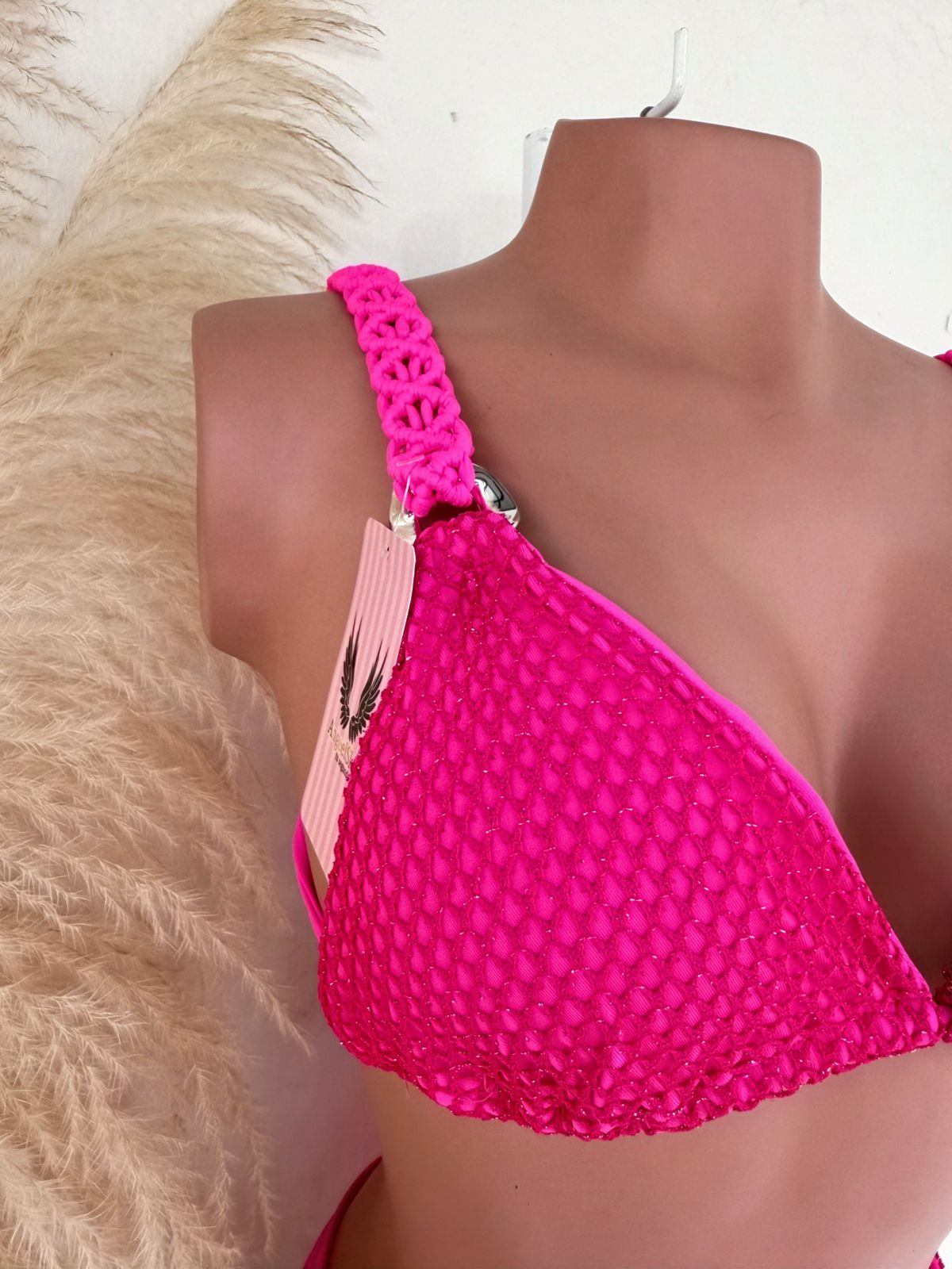 • Tirantes tejidos a mano en macramé de tono fucsia intenso.